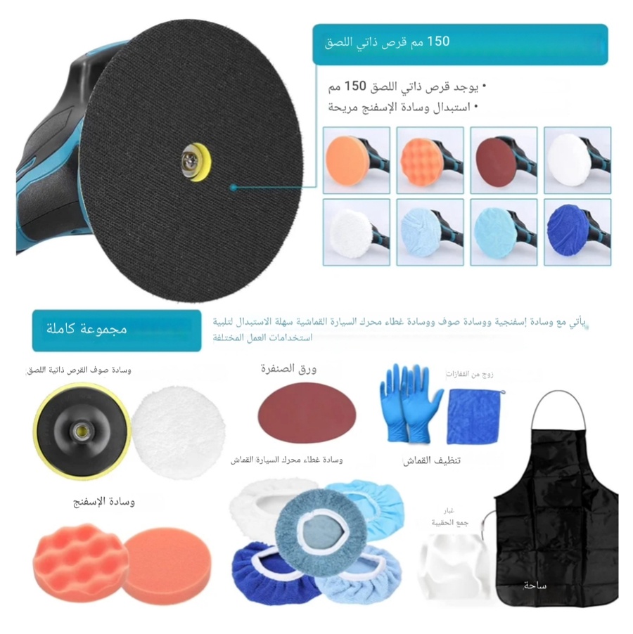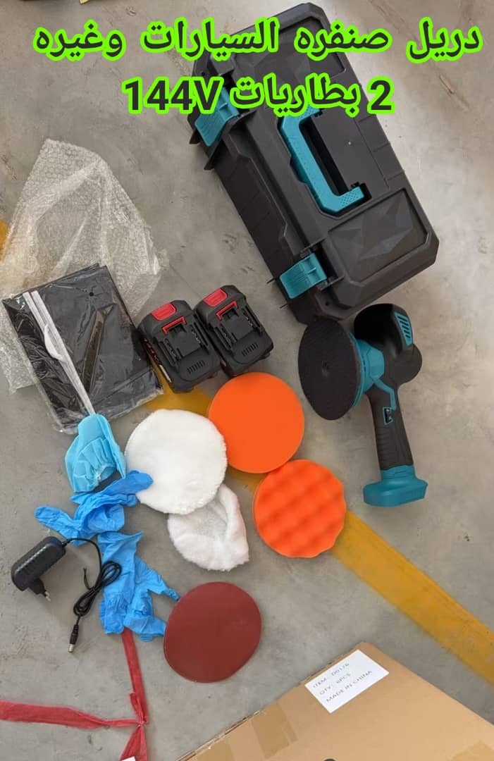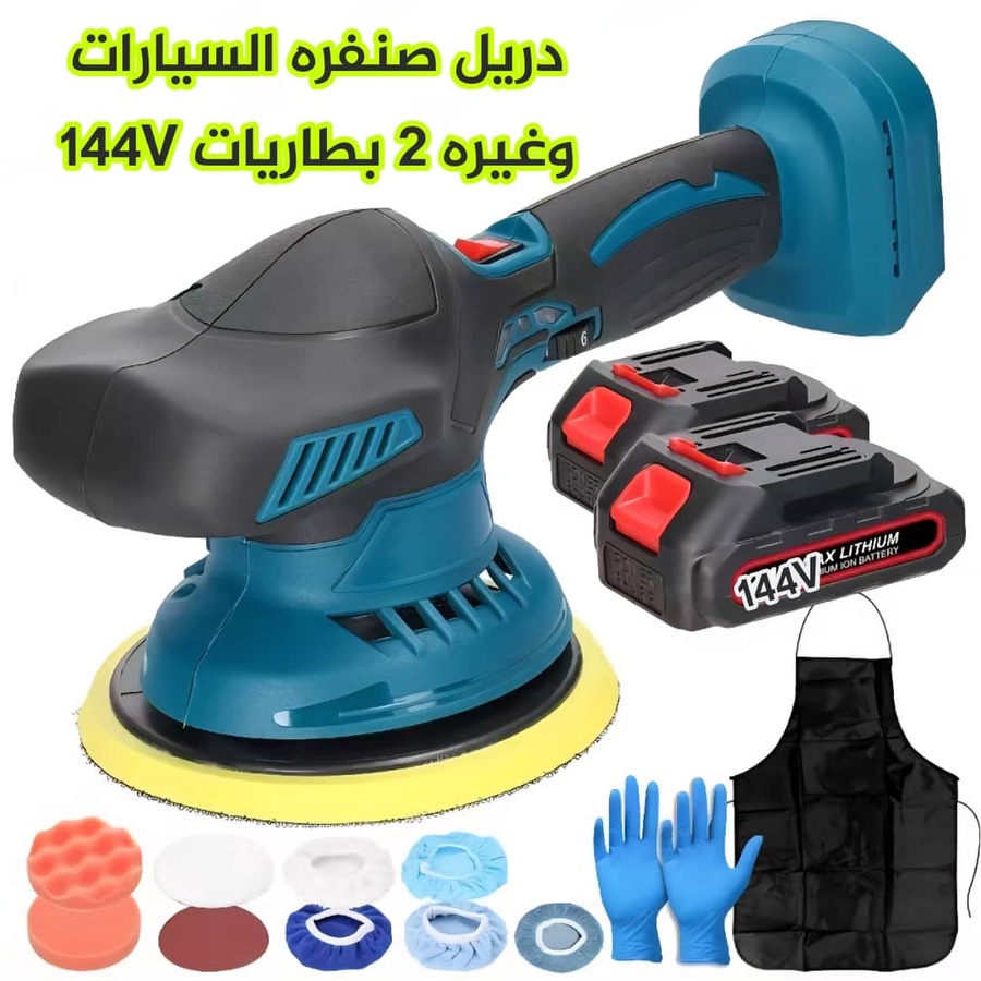 طقم عدة دريل صنفرة وتنظيف وتلميع لاسلكي ب2بطاريات بجميع المستلزمات والفرش وبطارية دبل 144فولت السيارات وب6سرعات تشغيل بحقيبة قوية وعدة كاملة من الفرش والفوط