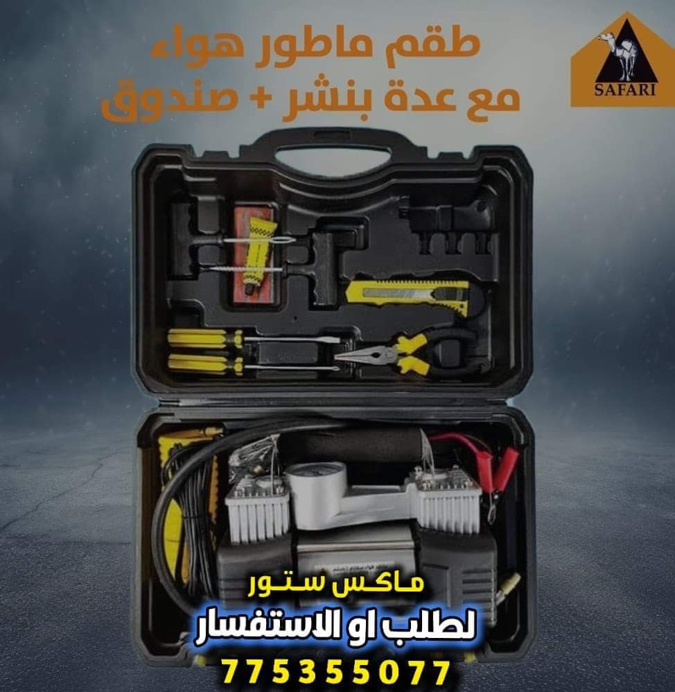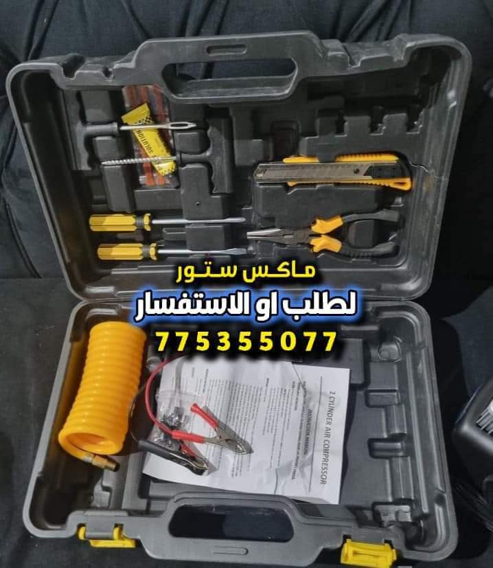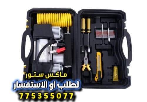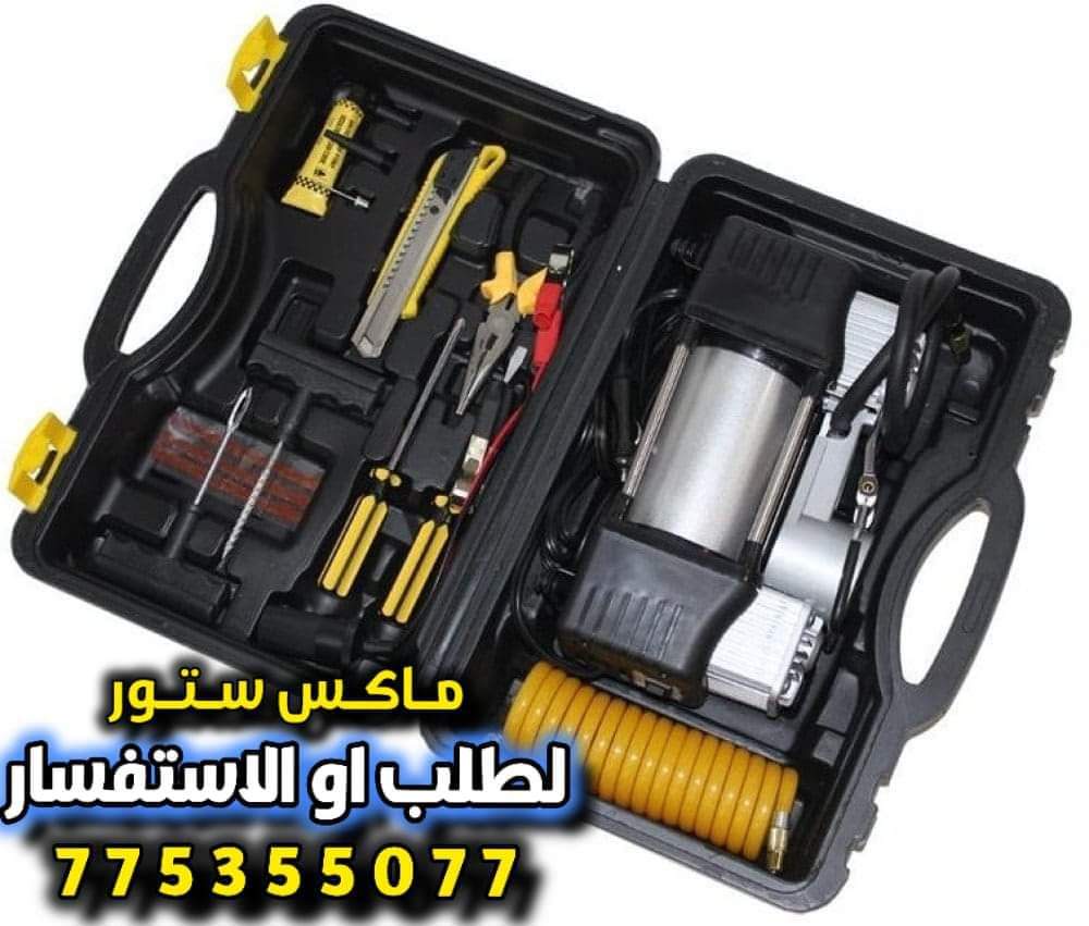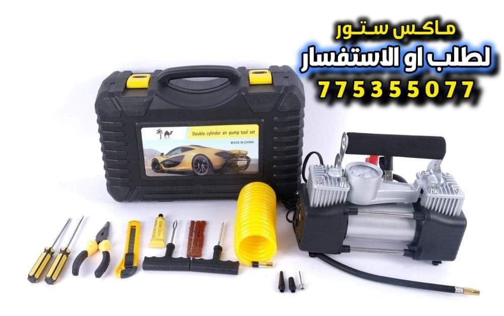 مع العدة كاملة - منفاخ هواء أثنين بستم - مع الليّ - مع معيار هواء - سلك أثنين راس يركب في الولاعة و البطارية - قطعتين رقع كفرات - أدوات الترقيع - مع غراء 2 سكروب - زرادية - مشرط - رأس تعبية كورة أو سيكل