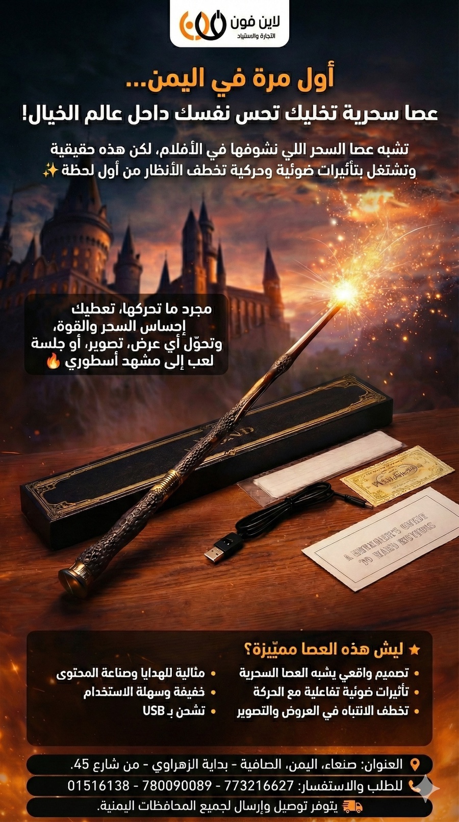 أول مرة في اليمن… عصا سحرية تخليك تحس نفسك داخل عالم الخيال! تشبه عصا السحر اللي نشوفها في الأفلام، لكن هذه حقيقية وتشتغل بتأثيرات ضوئية وحركية تخطف الأنظار