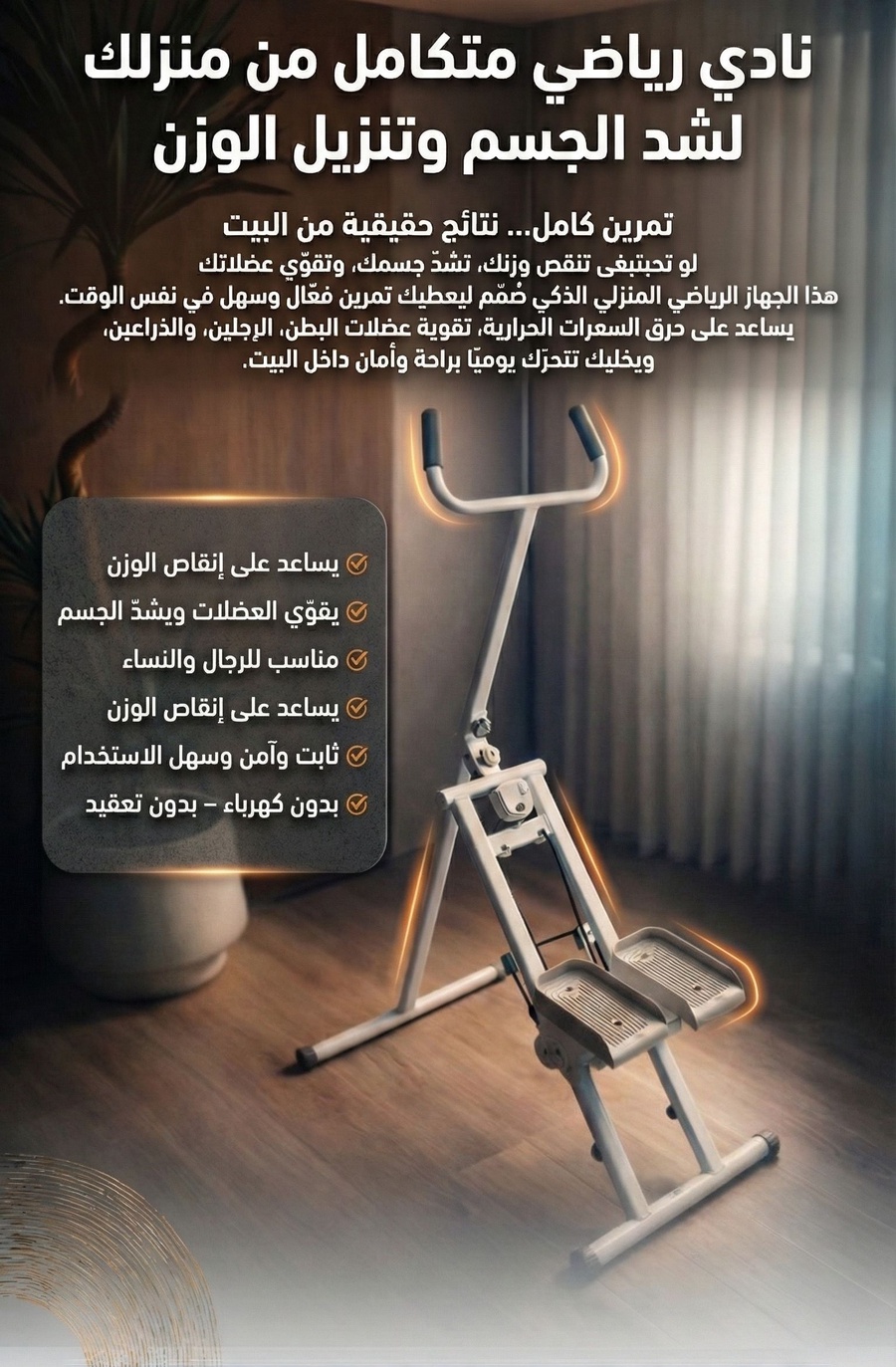 - مناسب للجميع: سواء كنت مبتدئ، رياضي محترف، أو حتى من كبار السن، الجهاز يوفر لك تمارين سهلة وفعالة تناسب قدرتك.