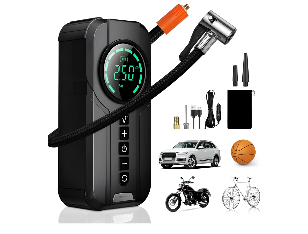 ولا يهمّك… هذا جهاز واحد يحل أخطر مشكلتين في السفر والخطوط الطويلة. اشتراك سيارة قوي + منفاخ هواء ذكي في جهاز محمول يعطيك راحة بال وينقذك وقت الشدّة.
