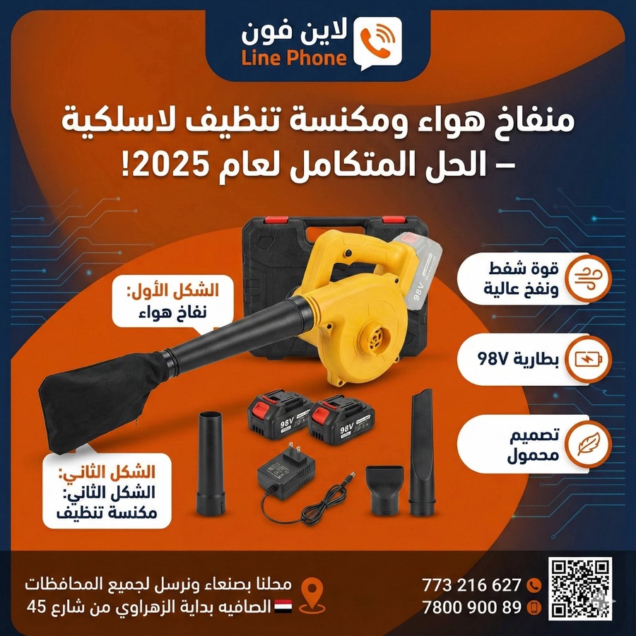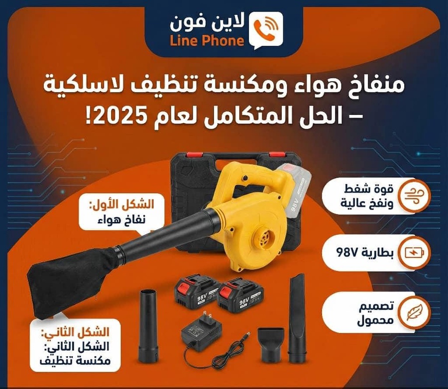 هل سيارتك مليانة وسخ؟ هل يحتاج ورشتك لتنظيف سريع؟ لا داعي للقلق بعد الآن! نقدم لك منفاخ هواء لاسلكي 2×1، الحل الأمثل لتنظيف سيارتك وورشتك بسرعة وسهولة.